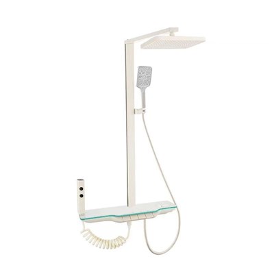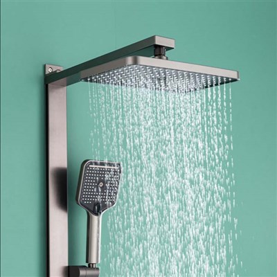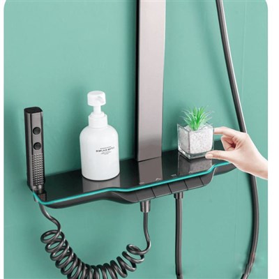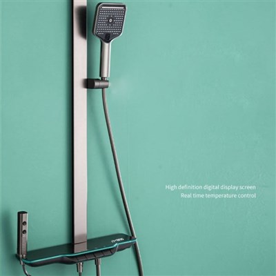 Gun gray square pipe wall-mounted constant temperature pressure shower set with piano key large storage shelf and mood lighting